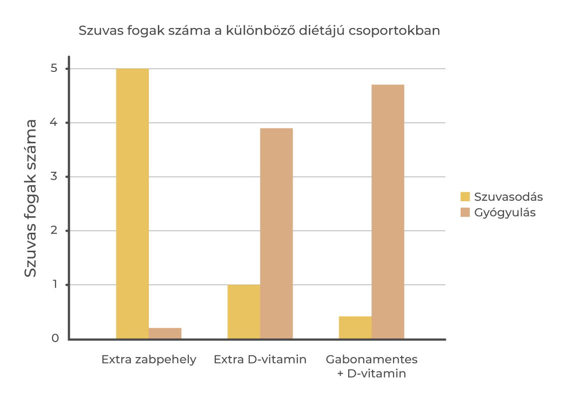 A legjobb eredményt azonban messze a gabonamentes, D-vitaminnal kiegészített étrend hozta: ennél csupán átlagosan 0,3 szuvas fog alakult ki, tehát minden harmadik gyermeknél 1 db.